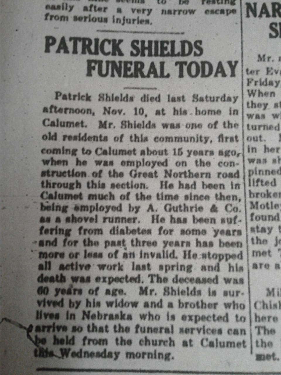I spent a week plus viewing old US Census micro films, at the Itasca County Historical society in Grand rapids MN, and did not find any records of any Shields family in the Calumet area. I then turned to Internet searches and found more Paddy Shields than expected and also that any Shields could have the nick name of "Paddy Shields"!